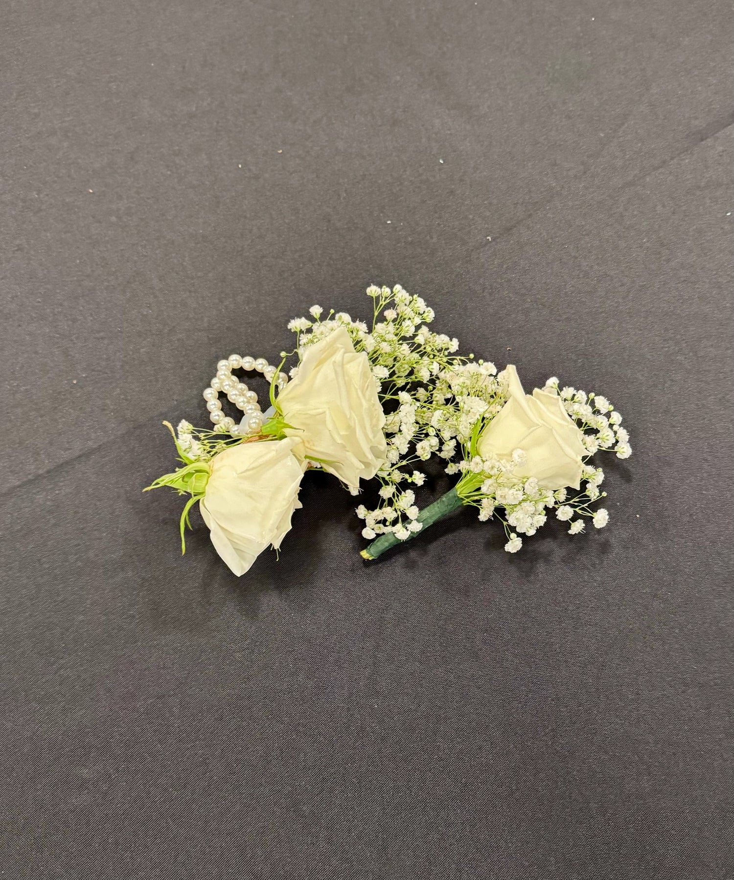 Corsage | Florals and greenery on a pearl wrist band. Usually for mothers and grandmothers.