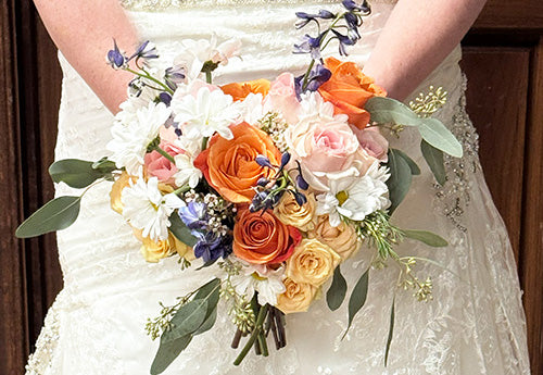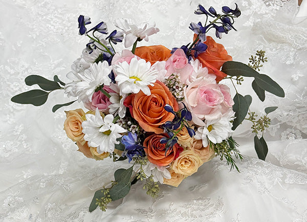 A beautiful bouquet that is about 10-12 inches wide, wrapped in ribbon. Bouquets come in a glass vase with water. Shown here on the table in a vase making a great centerpiece after the ceremony.