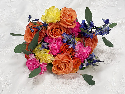 A beautiful bouquet that is about 10-12 inches wide, wrapped in ribbon. Bouquets come in a glass vase with water. Shown here on the table in a vase making a great centerpiece after the ceremony.