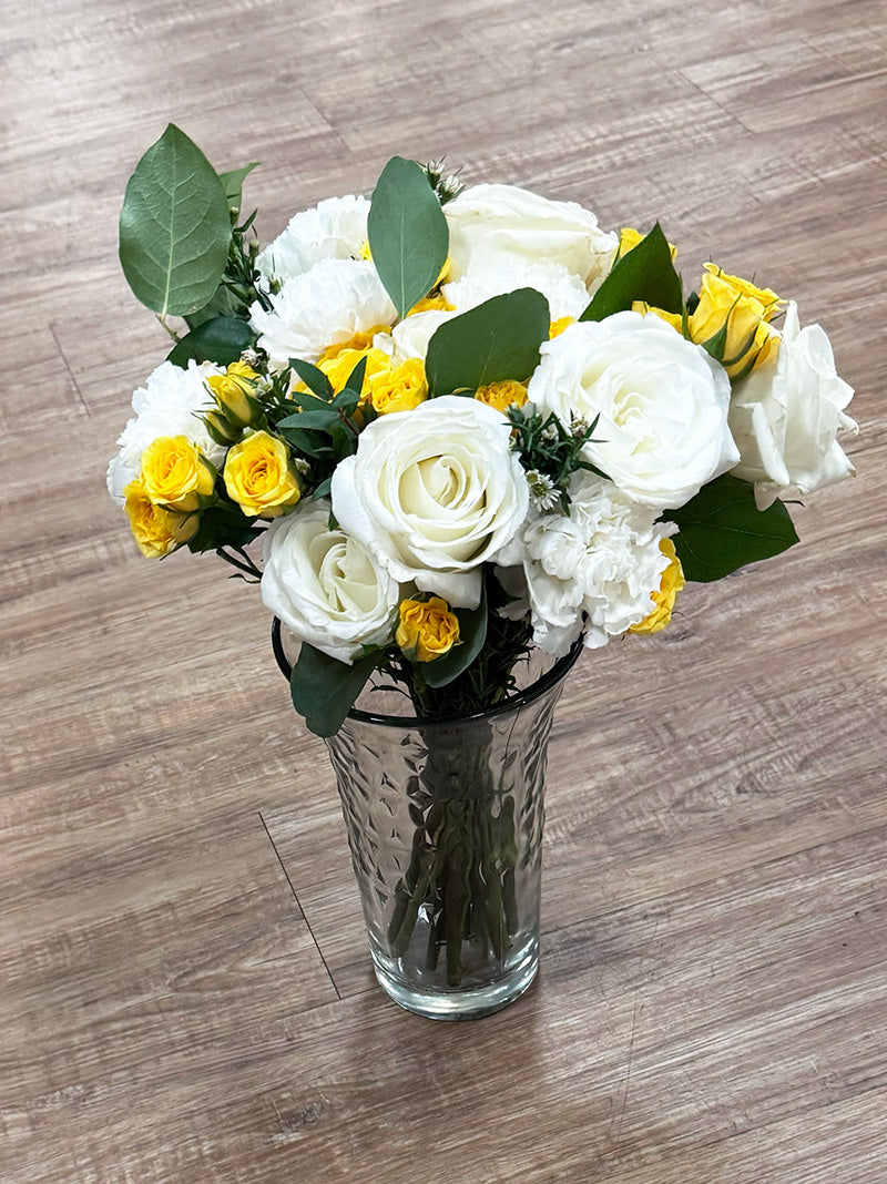 Bring instant happiness with the 'Rays of Sunshine' collection. This eye-catching arrangement is a brilliant burst of floral color, pairing vibrant yellow and crisp white blooms for a beautiful, high-contrast effect. It's the perfect combination to add warmth and joy.