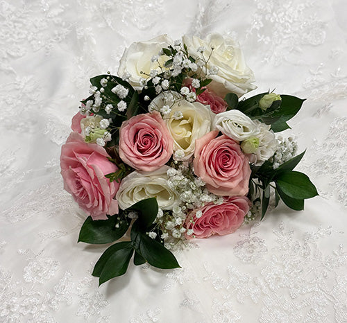 A beautiful bouquet that is about 10-12 inches wide wrapped in ribbon. Bouquets come in a glass vase with water.