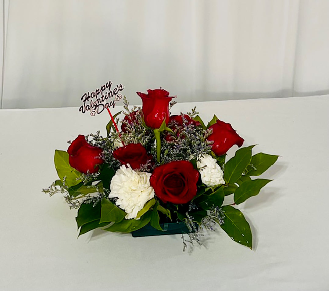 This charming arrangement features seven elegant roses paired with three delicate carnations, all artfully arranged in a circular dish design. The classic combination of roses and carnations creates a playful yet romantic display that celebrates affection and admiration. Perfect for expressing your feelings or brightening someone's day, this circular composition brings a whimsical touch to any space. The dish design makes it easy to display and enjoy, whether you're treating yourself or surprising someone special with a burst of floral joy.