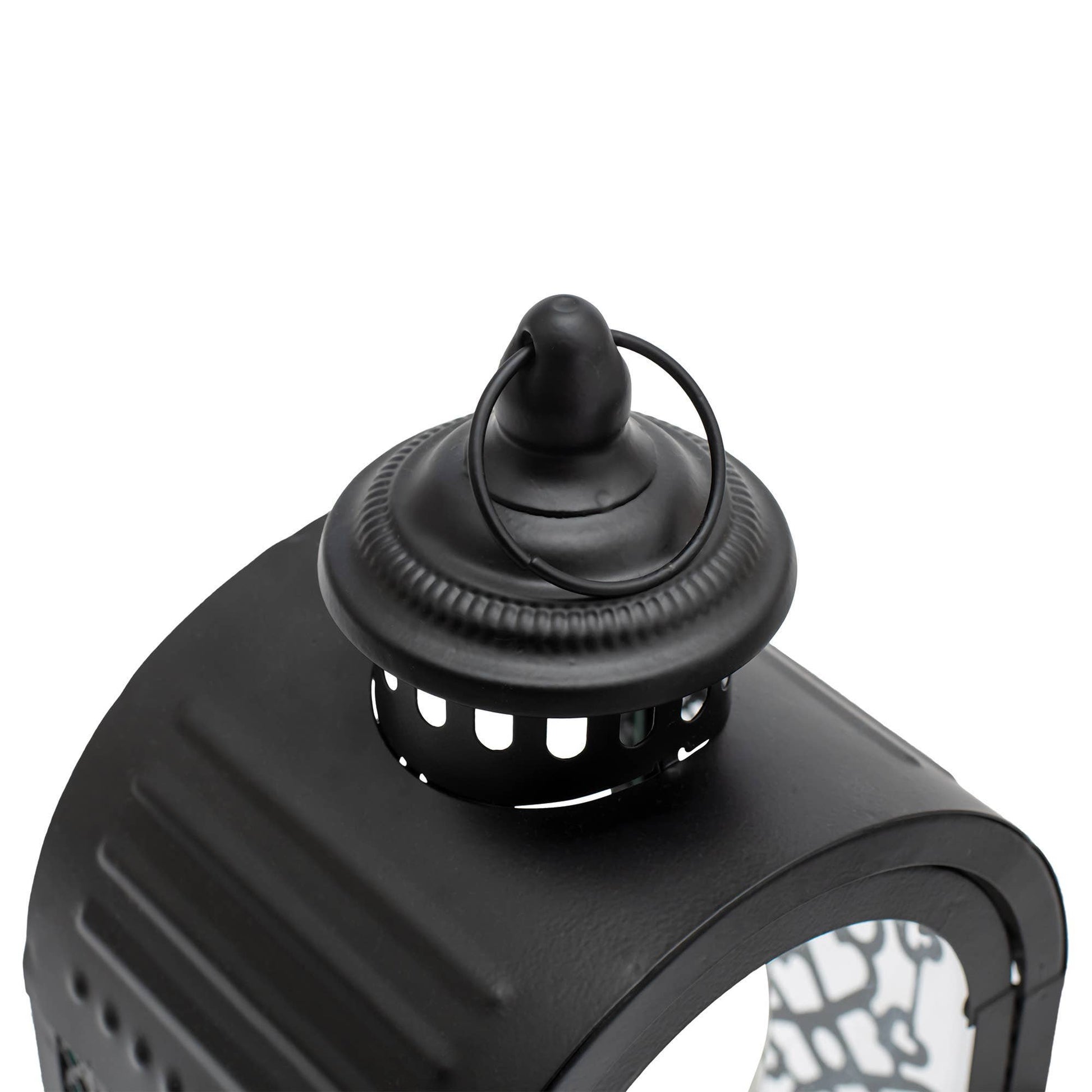 This elegant black metal lantern features an arched design with lacy filigree sides, glass panels, and a curved latch. A flickering LED candle inside (included) casts a soft, comforting glow — a beautiful tribute and source of peace during times of loss.