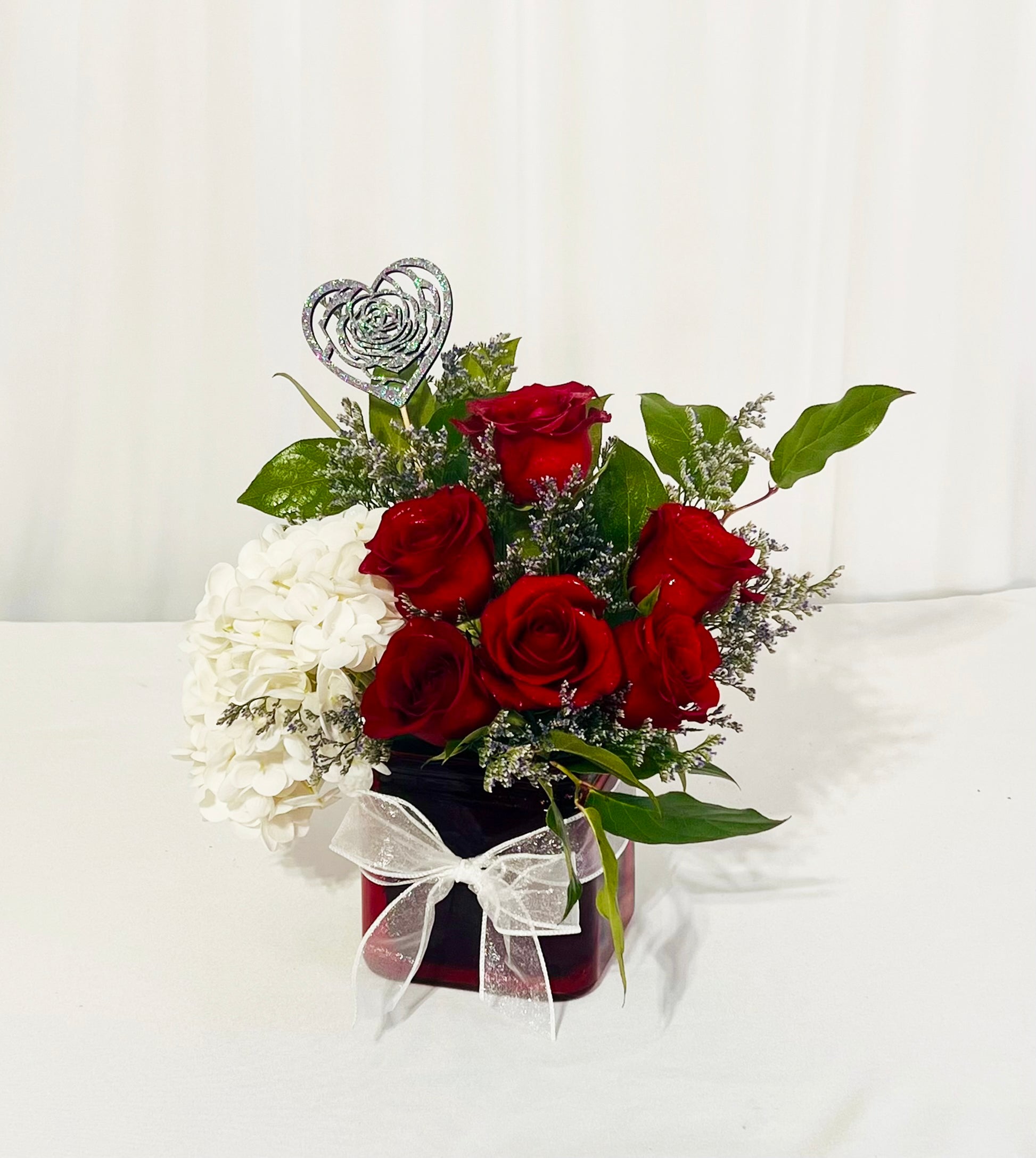 A lucky set of seven red roses and gorgeous hydrangea fill this cube vase, creating a stunning arrangement that's perfect for celebrating love, romance, or any special occasion. The vibrant red roses symbolize deep affection, while the lush hydrangea adds texture and dimension to the design. Presented in a sleek cube vase, this charming bouquet makes an ideal gift for your sweetheart, a romantic gesture for date night, or a delightful way to brighten someone's day. Whether you're expressing your feelings or simply spreading joy, this lucky combination of blooms delivers beauty and meaning in one gorgeous package.